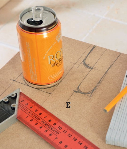 Putket piirretään paneeliin (E) - käytä harp-pia tai lasia tai sopivan kokoista purkinkantta. Etäisyys levyn ylä-reunasta pyöristykseen on sama kuin etäisyys katosta putkeen.