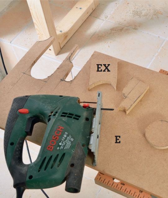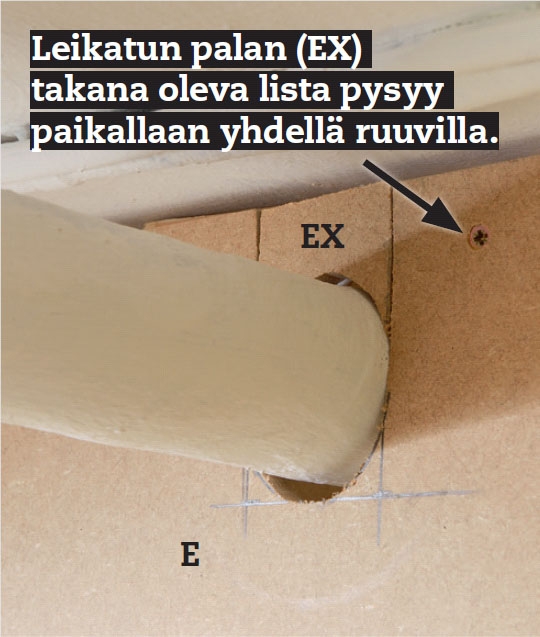 Loput pienet levynpalat (EX) liimataan putkien yläpuolelle. Kiinnitämme ensin listanpalan paneelin taakse jokaisessa leikkauskohdassa, jotta pienet leikatut palat saadaan johonkin kiinni.