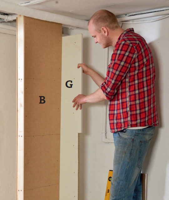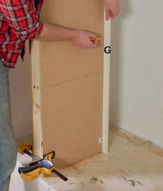 Taustalevy (G) sahataan ja kiinnitetään 4 x 30 mm ruuveilla väliseinään. Edessä se myötäilee seinää, ylhäällä se muodostaa 5 cm leveän alustan.