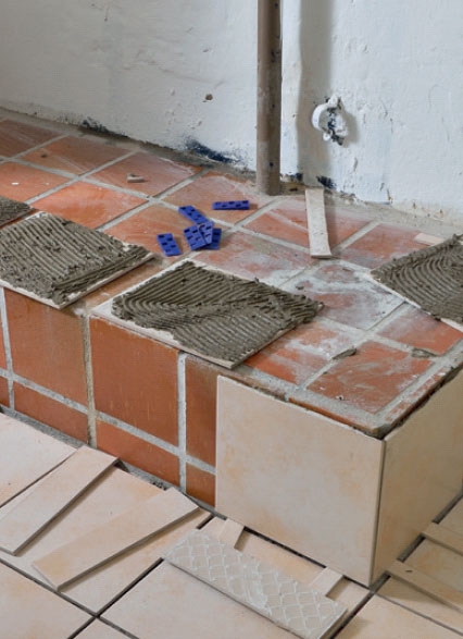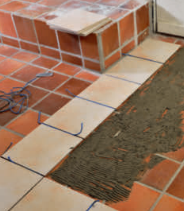 Lattiaan asennettiin vaaleat lattialaatat. Tämä sujui odotettua helpommin, sillä vanhat laatat olivat tiukasti kiinni ja olivat hyvä alusta uusille.