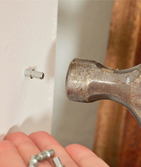 Hyllynkannattimet iske-tään reikiin. Käytämme pieniä pyöreitä, kauluksellisia metallikannattimia. Toisin kuin tasaiset mallit, nämä estävät urallisia hyllyjä liukumasta.