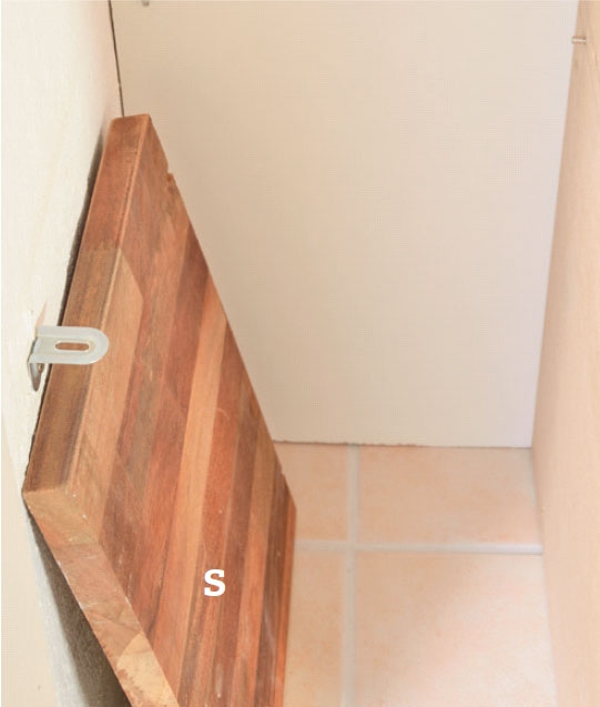 Kellarinseinään kiinnitetään pienet kalustekulmat kapeille hyllyille (S). Kalustekulmat kiinnitetään ruuveilla ja kiviseinän ruuvitulpilla.