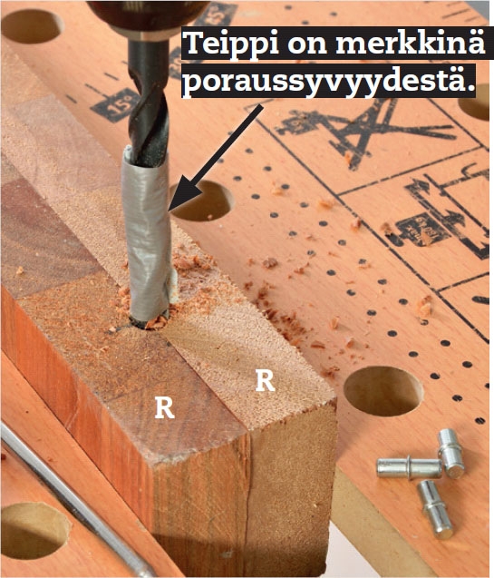 Hyllyihin (R ja S) pora-taan urat, joiden avulla hyllyt pysyvät hyvin hyllyn-kannattimissa. Tämä tehdään puristamalla hyllyt yhteen ja poraamalla suoraan liitoksen keskelle 8 mm poralla.