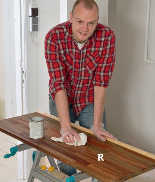 Hyllyt (R ja S) öljytään pöytälevyöljyllä. Öljy sivellään vastahiotulle puulle ja työstetään puuhun märkähio-mapaperilla tai karkealla sienellä. Ylimääräinen öljy pyyhitään pois liinalla 20 minuutin kuluttua.