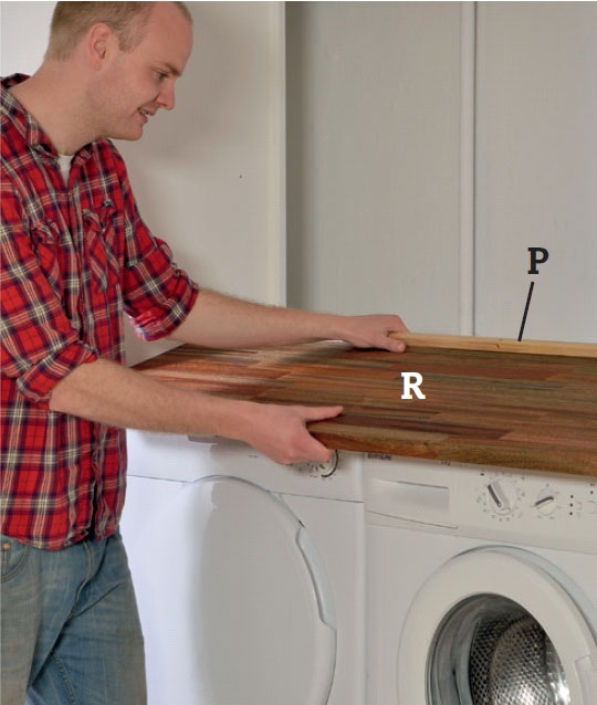 Koneet ja alin hylly (R) asennetaan. Tarkista, että molemmat koneet seisovat vaa-terissa. Hyllyn takareunan päälle tulee takalevyn (C) edessä oleva 4. ja viimeinen lista (P).