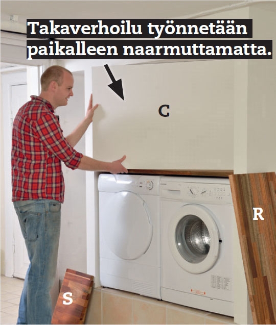 Kaapiston tasoitus ja maalaus vei muutaman päivän. Nyt maali on kuivunut ja tar-peeksi kovaa, joten voimme työntää koneet paikoilleen, asentaa irtohyllyt hyllynkan-nattimille ja kiinnittää vii-meisen takalevyn, joka asetetaan listoille ylimmän irralli-sen hyllyn kanssa.