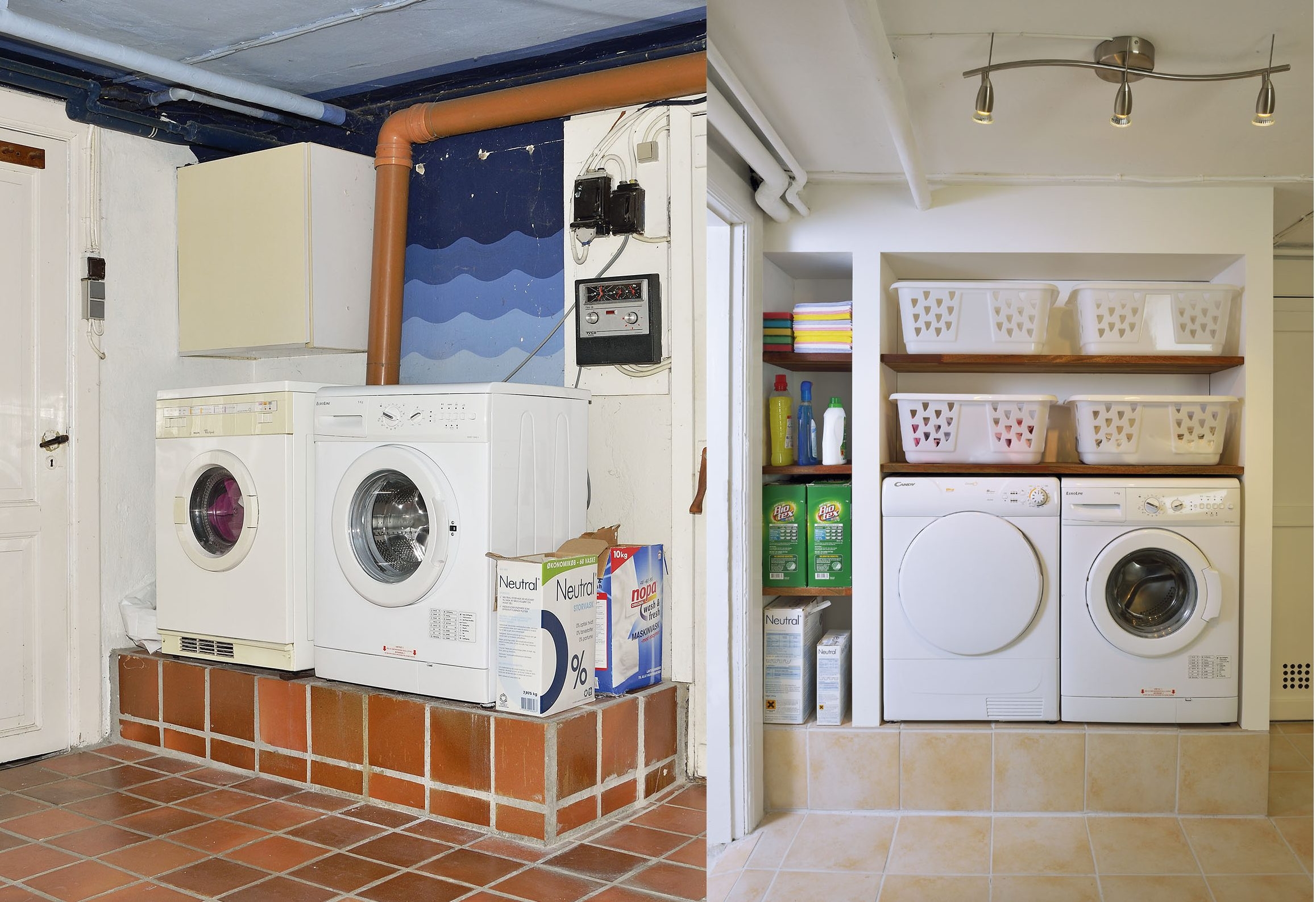 Uusi kaapisto takaa järjestyksen, mutta pyykkitilan muutos alkoi lattian ja seinien vaalennuksesta.
