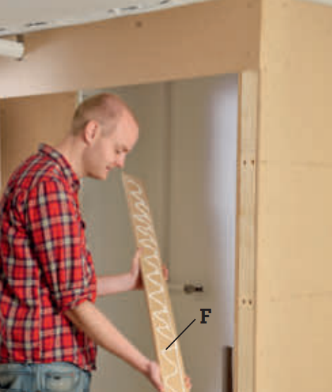 Etupaneelit F kiinnite-tään kahteen seinään. Niihin on sivelty vanat valkoista puuliimaa.
