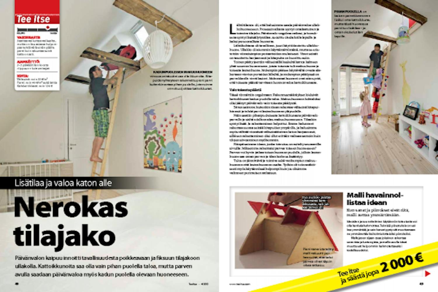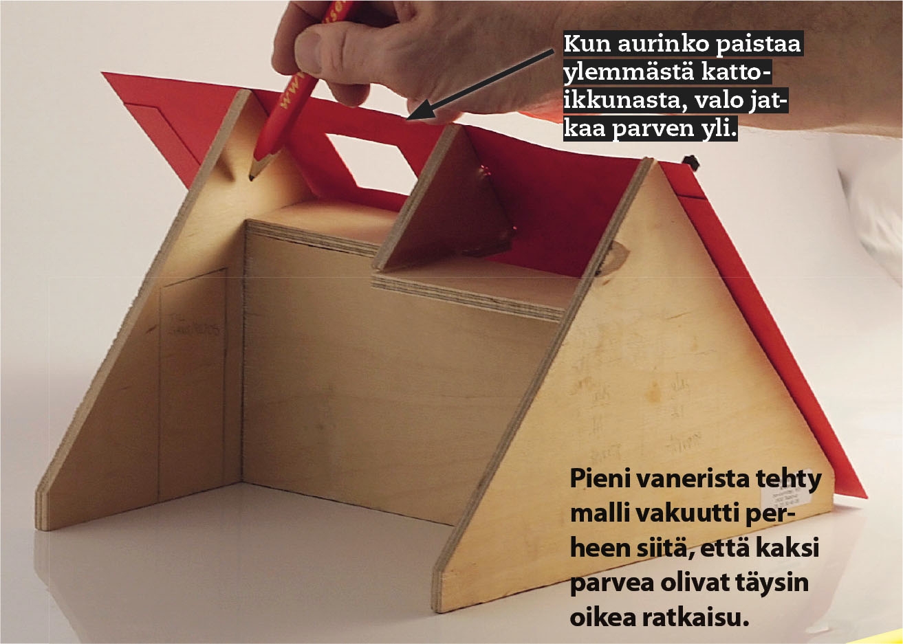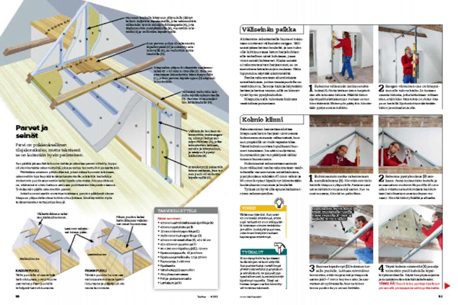 Rakentaminen kannattaa aloittaa kitapuusta katon harjaan ulottuvasta kolmionmuotoisesta väliseinästä, kun sen ympärillä on vielä vapaata tilaa. Tämä kolmio erottaa lopullisesti huo-neet toisistaan. Jos sitä ei suljettaisi, kummankin parven päädystä näkisi toiseen huoneeseen.