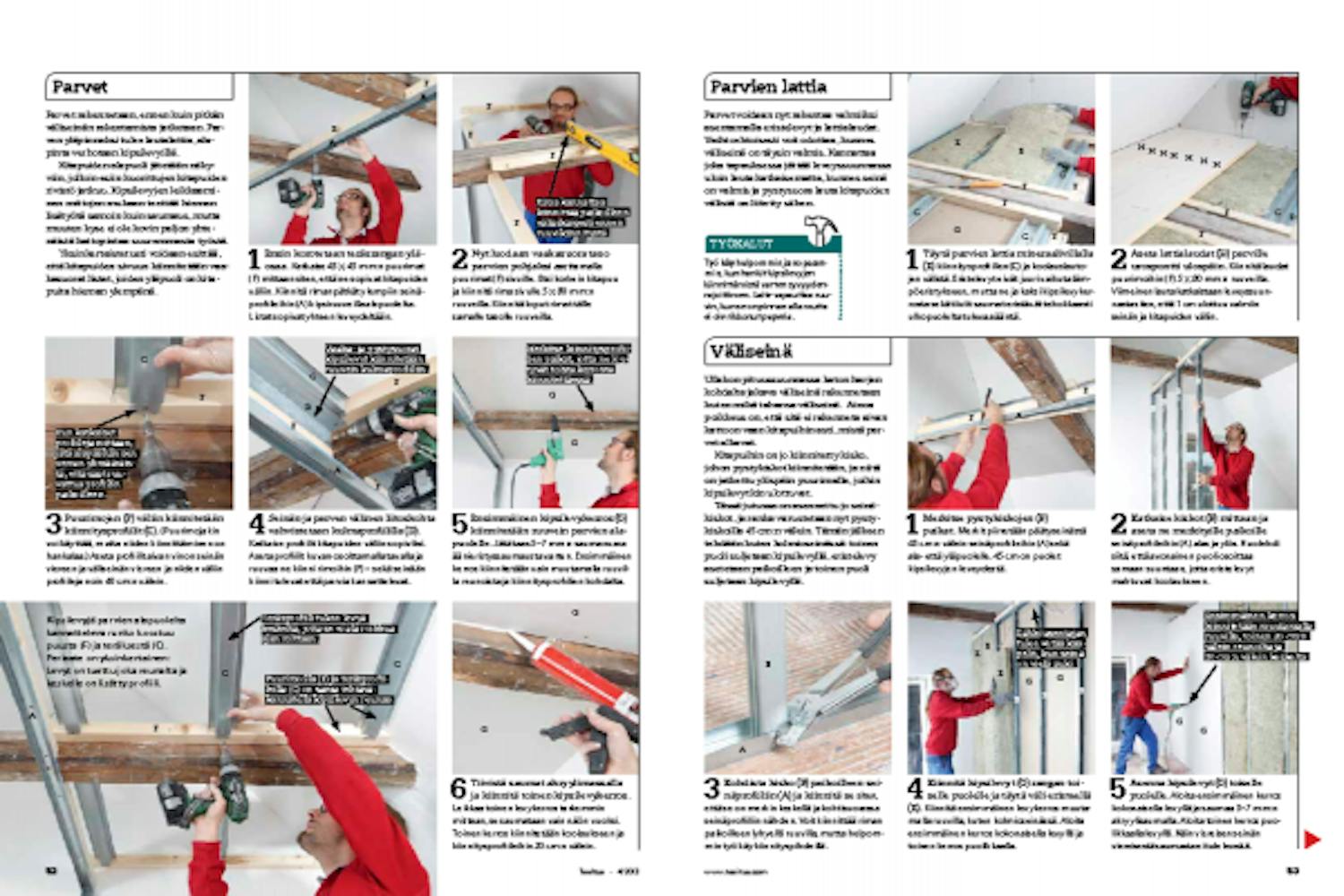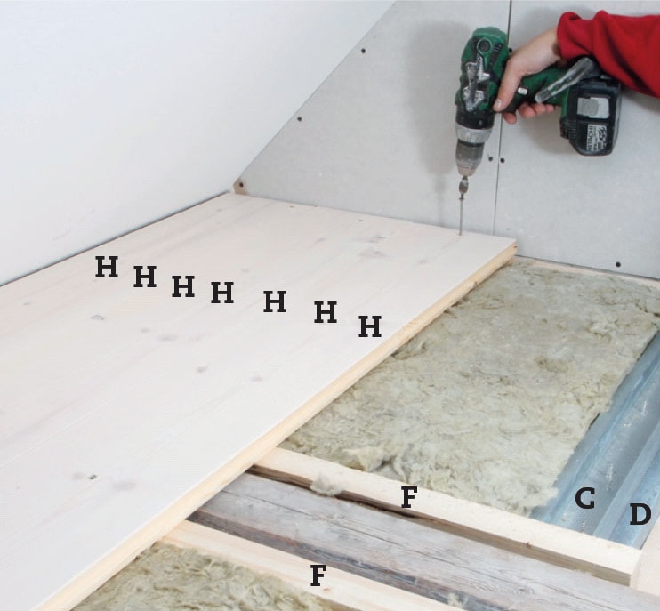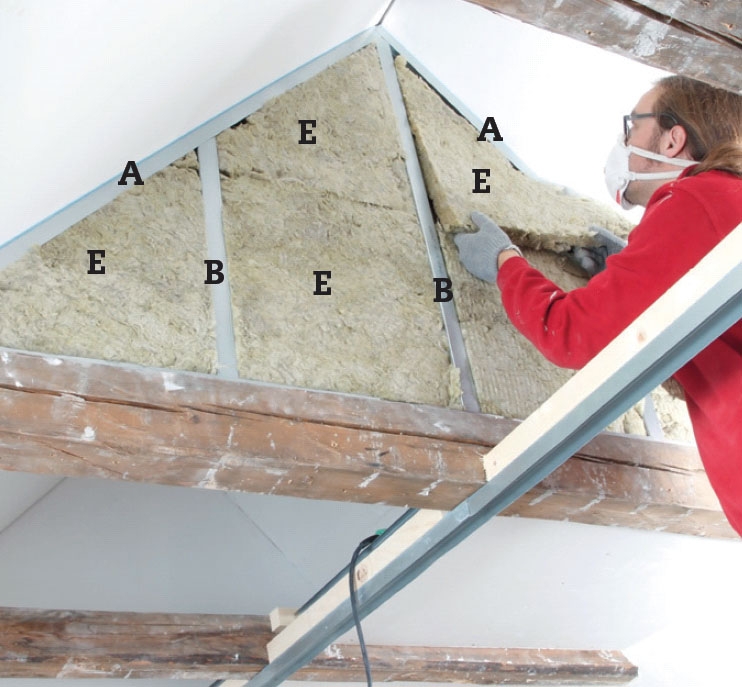 Täytä parvien lattia mineraalivillalla (E) kiinnitysprof ilien (C) ja koolauslauto-jen välistä. Eristelevyt eivät juuri vaikuta läm-pöeristykseen, mutta ne ja kaksi kipsilevyker-rosta sekä tiiviit saumat eristävät tehokkaasti ulkopuolelta tulevaa ääntä.