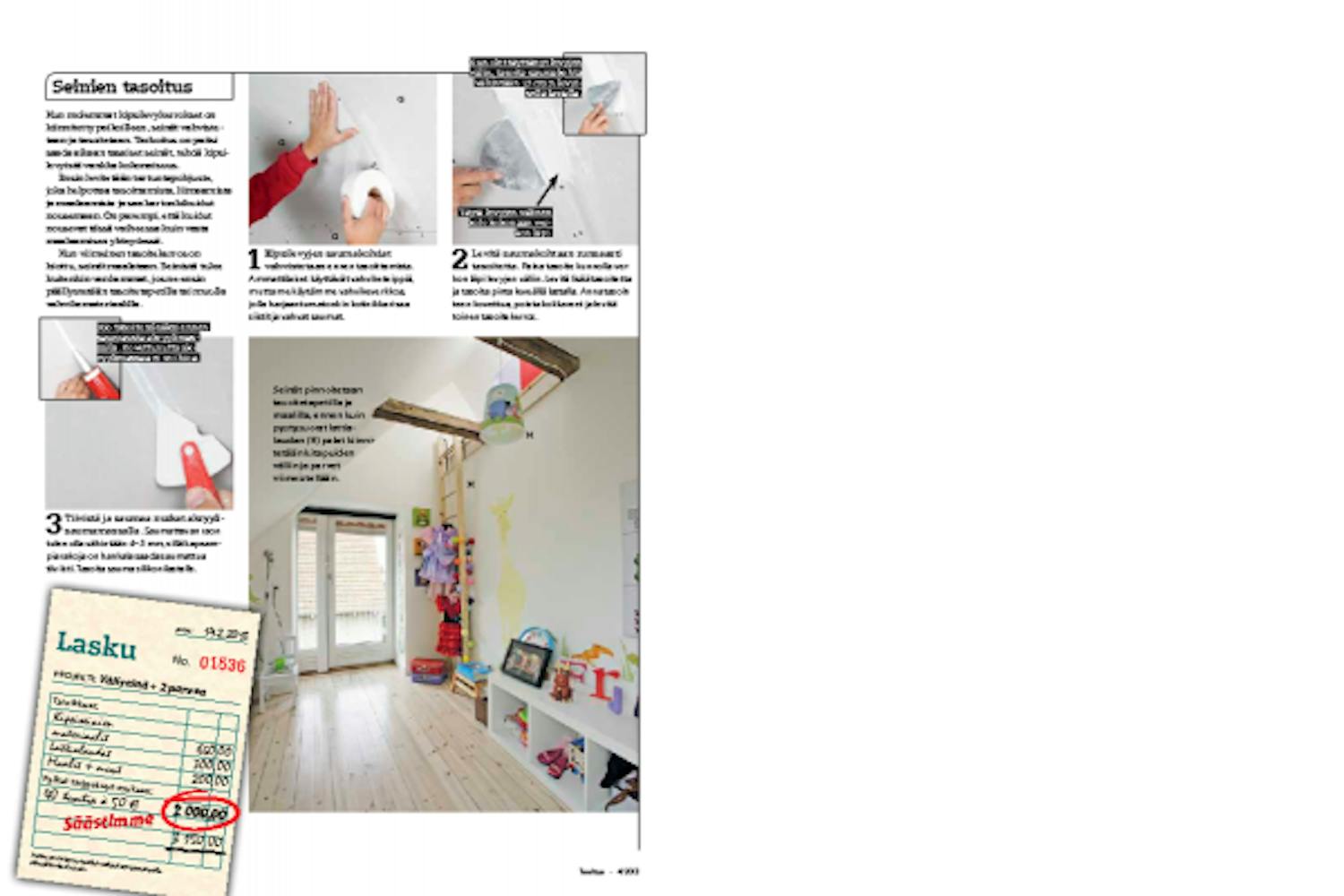 Kun molemmat kipsilevykerrokset on kiinnitetty paikoilleen, seinät vahviste-taan ja tasoitetaan. Tarkoitus on paitsi saada aikaan tasaiset seinät, tehdä kipsi-levyistä vankka kokonaisuus.