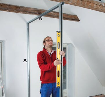 Rakenna väliseinän ranka seinäkis-koista (A). Aloita lattiaan katon harjakohdan alle tulevasta kiskosta. Määritä kiskon sijaintipaikka lattialautojen mukaan ennen kiinnittämistä. Molempiin päätyihin kiinnite-tään pystysuora seinäkisko.
