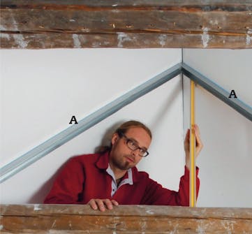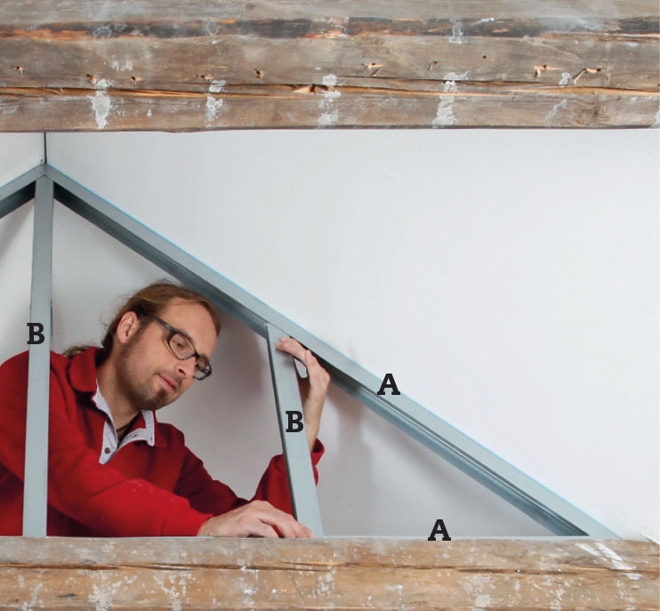 Kolmioseinän ranka rakennetaan seinäkiskoista (A). Kiinnitä ensin kisko keskelle kitapuun yläpuolelle. Aseta seuraa-vat seinäkiskot vinoja seiniä vasten. Kun ne ovat suorassa, kiinnitä ne paikoilleen.