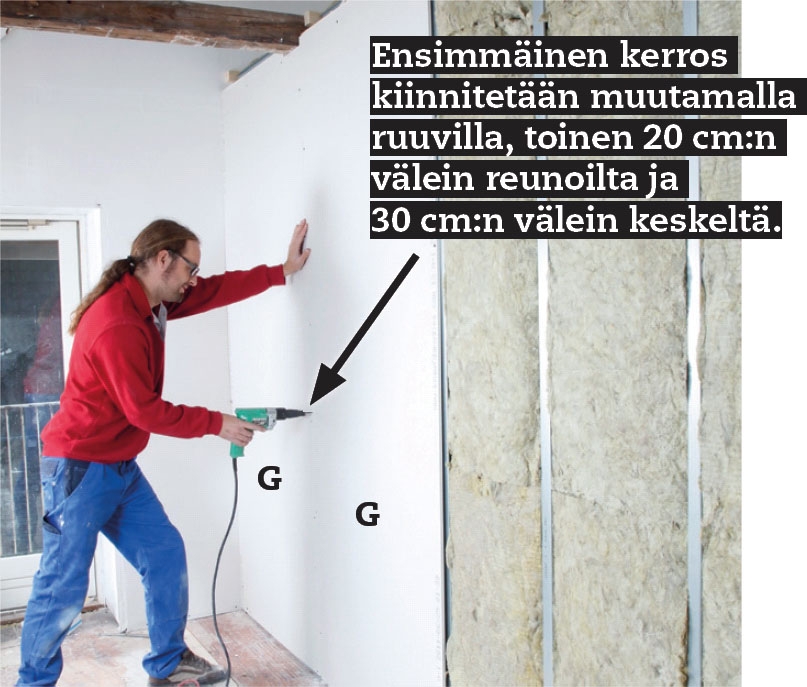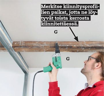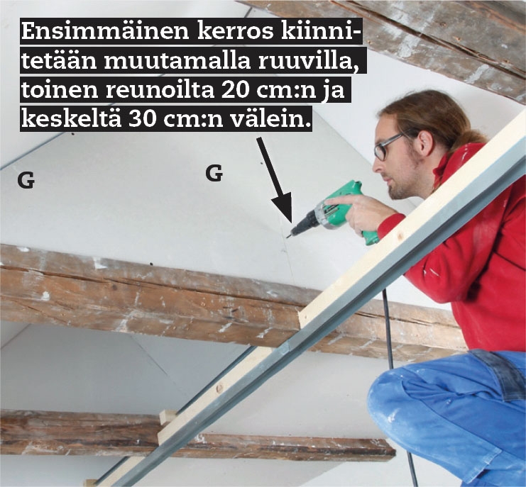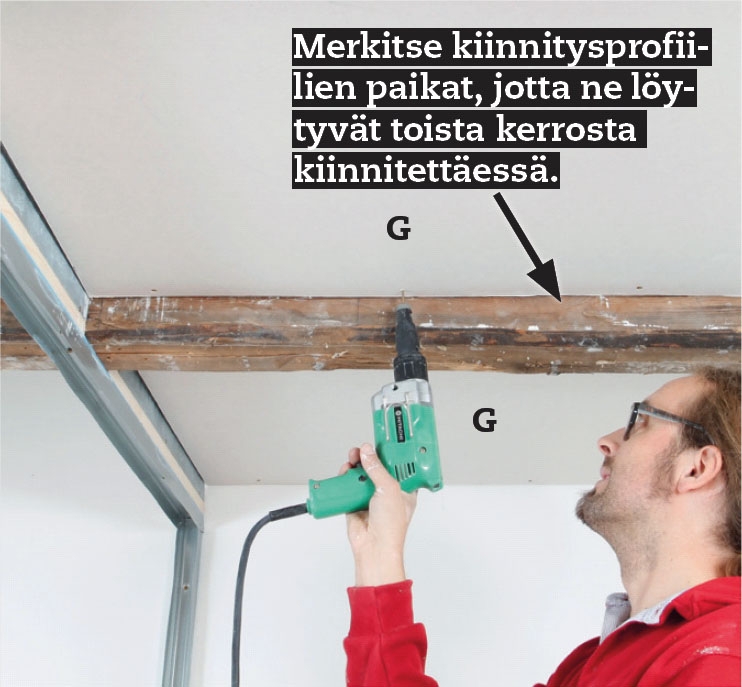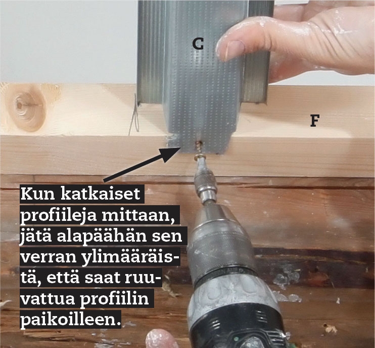 Ensimmäinen kipsilevykerros (G) kiinnitetään ruuvein parvien ala-puolelle. Jätä taas 5-7 mm:n saumanvara äänieristyssaumausta varten. Ensimmäinen kerros kiinnitetään vain muutamalla ruuvil-la reunoista ja kiinnitysprof ilien kohdalta.