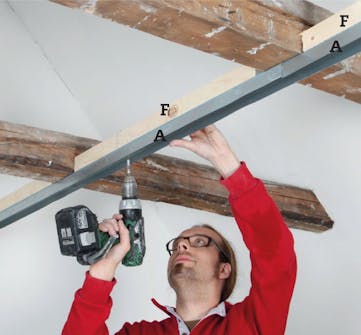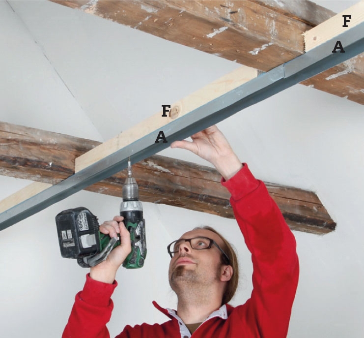 Ensin korotetaan teräsrangan yläosaa. Katkaise 45 × 45 mm:n puurimat (F) mittaan siten, että ne sopivat kitapuiden väliin. Kiinnitä rimanpätkät ylempiin seinä-profileihin (A) kipsiruuveilla alapuolelta. Listat sopivat yhteen leveydeltään.