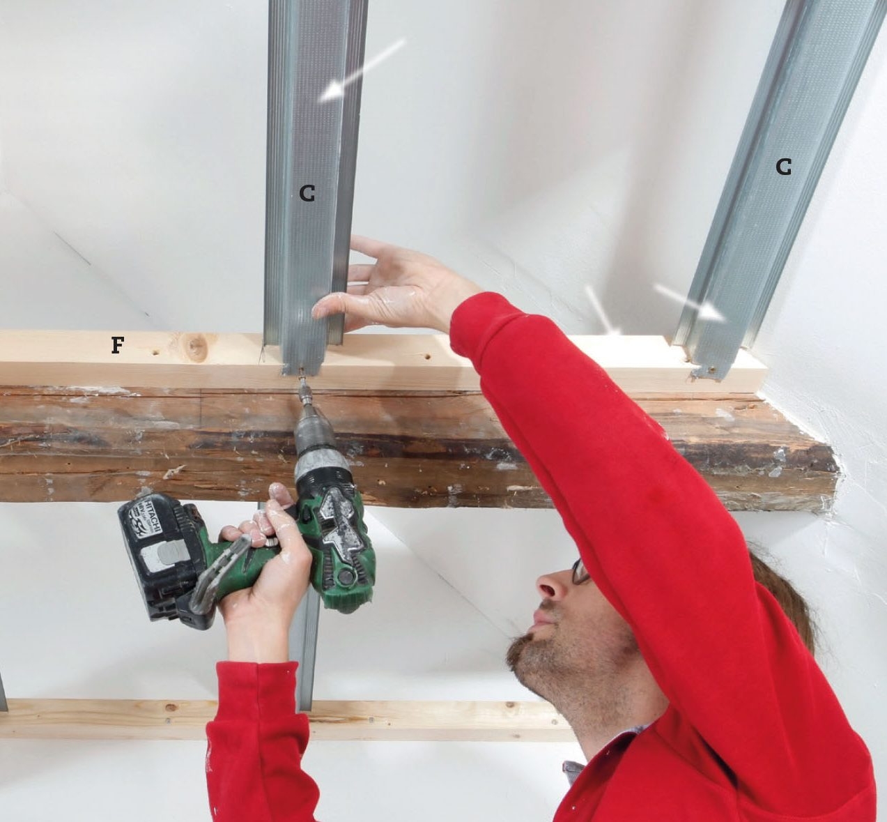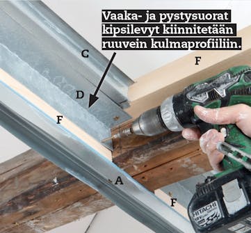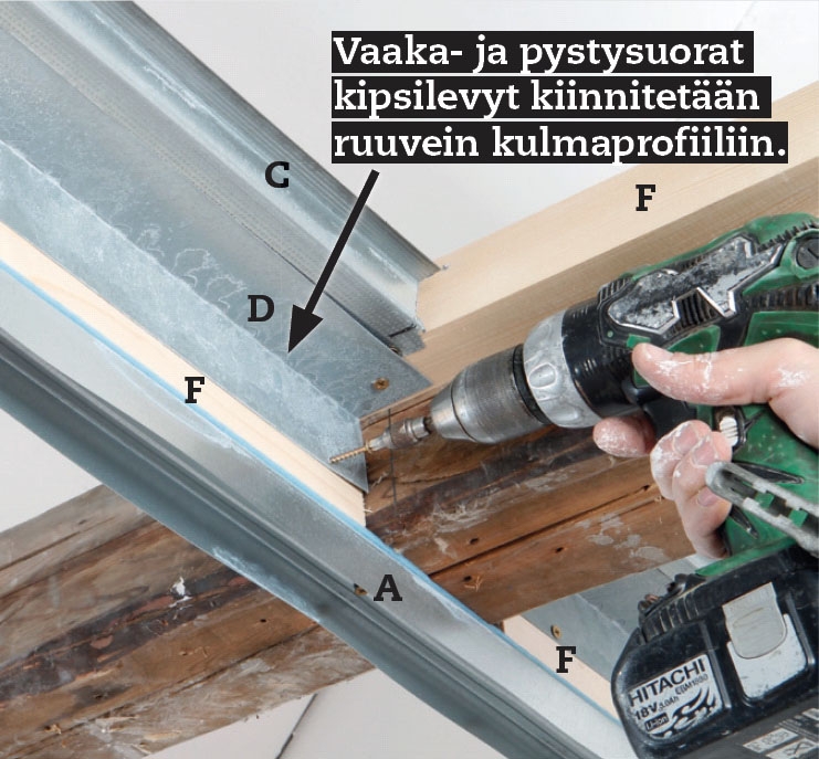 Puurimoilla (F) ja teräsprofii-leilla (C) on sama tehtävä: kannatella kipsilevyn reunaa.