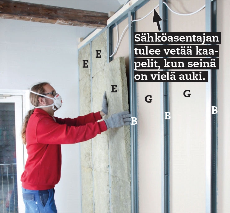Kiinnitä kipsilevyt (G) rangan toiselle puolelle ja täytä väli eristeellä (E). Kiinnitä ensimmäinen levykerros muuta-malla ruuvilla, kuten kolmioseinässä. Aloita ensimmäinen kerros kokonaisella levyllä ja toinen kerros puolikkaalla.