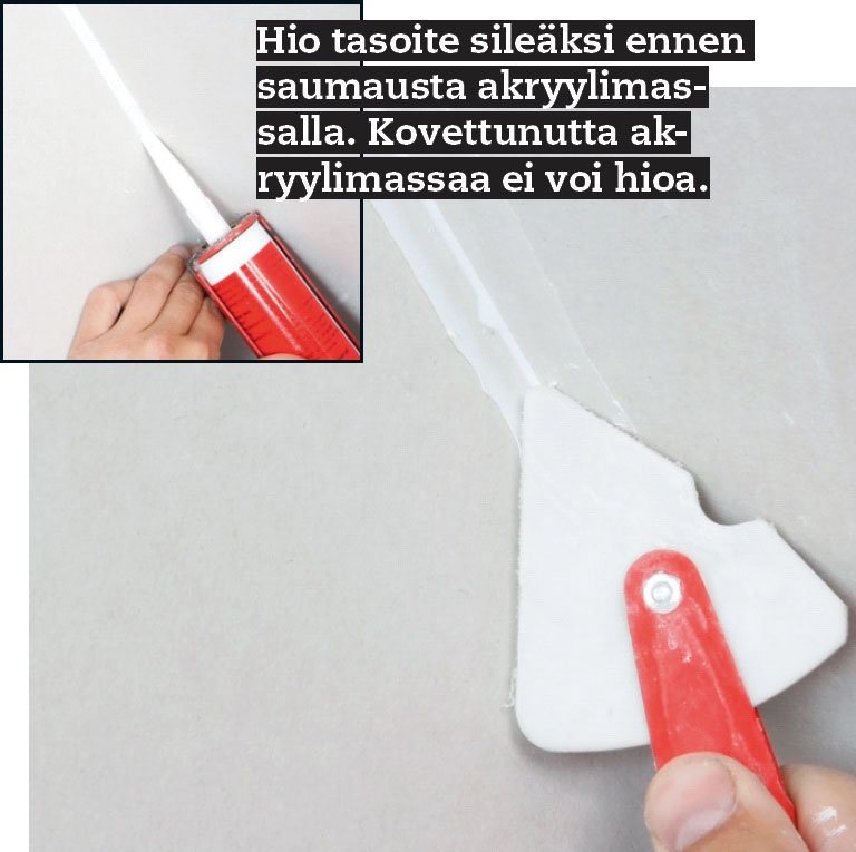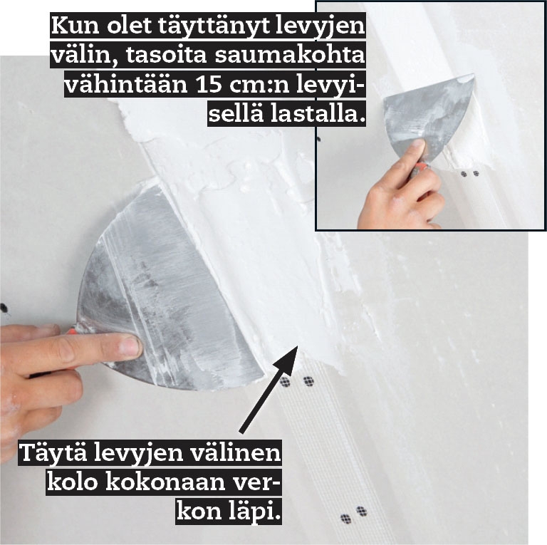 Levitä saumakohtaan runsaasti tasoitetta. Paina tasoite kunnolla ver-kon läpi levyjen väliin. Levitä lisää tasoitetta ja tasoita pinta leveällä lastalla. Anna tasoit-teen kovettua, poista kokkareet ja levitä toinen tasoitekerros.