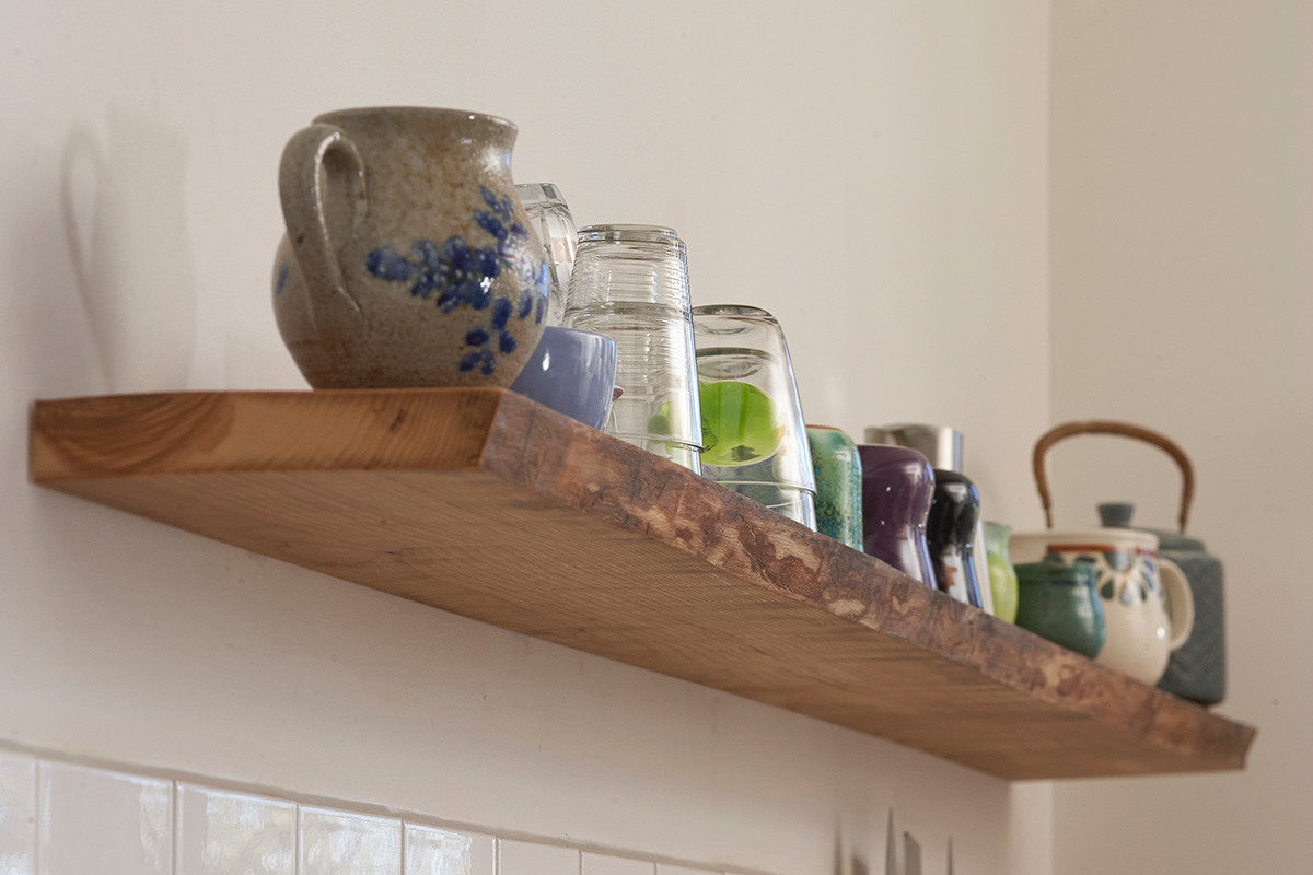 Poraa hyllyn takareunaan reiät hyllyä kannatteleville kierretangoille, jotka työnnetään lau dan (X) läpi. Lauta on ruuvat-tu kiinni, sillä sitä käytetään pora-ohjaime na seinässä. 10 cm syvät reiät on tehtävä täysin suoraan.