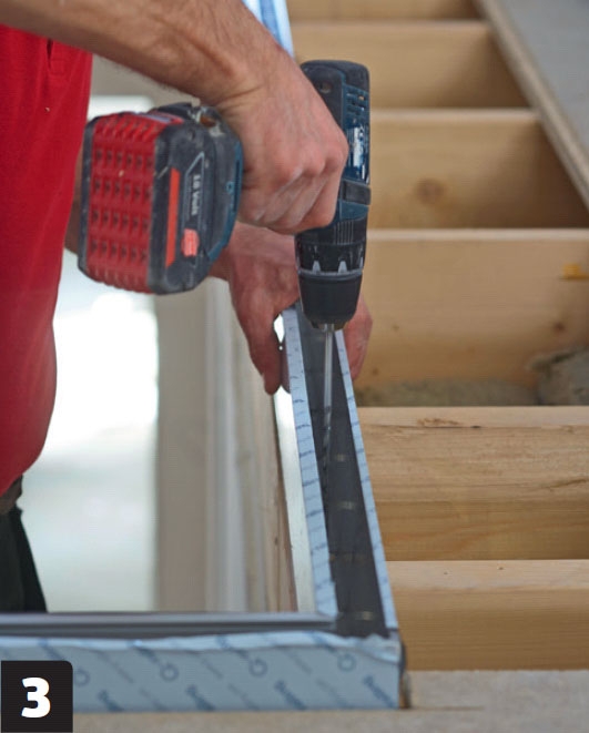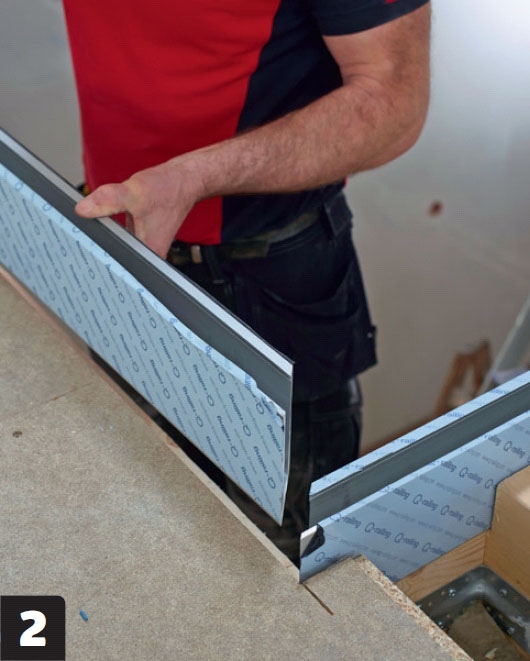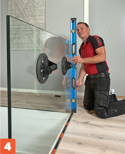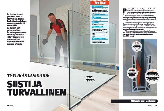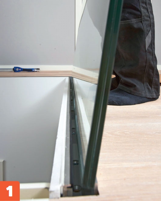 Nämä lasikaiteet asennetaan portaiden yläpäähän. Normaalisti kiskot ruuvataan kiinni lattiaan, mutta koska lattiaa vasta rakennetaan, kiskot voi upottaa lattian sisään. Siten kiskot nousevat vain sentin lattialautojen päälle. Lattiaan upotettu kisko saa lasin näyttämään siltä, kuin se kasvaisi suoraan lattiasta.