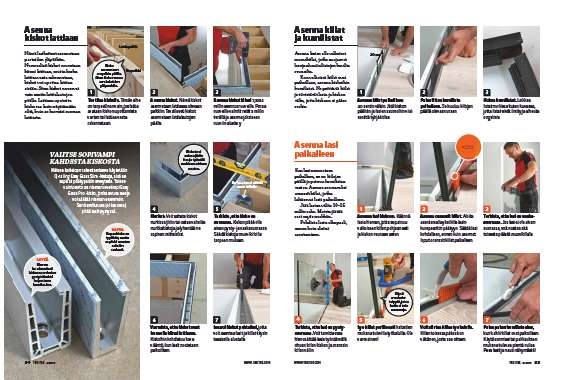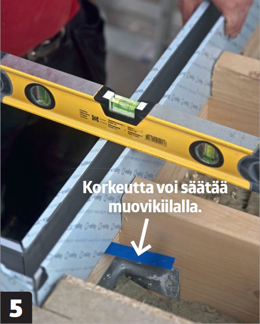 Tarkista, että kisko on suorassa. Kiskon pitää olla aivan pysty- ja vaakasuorassa. Säädä kiskoja muovikiiloilla tarpeen mukaan.