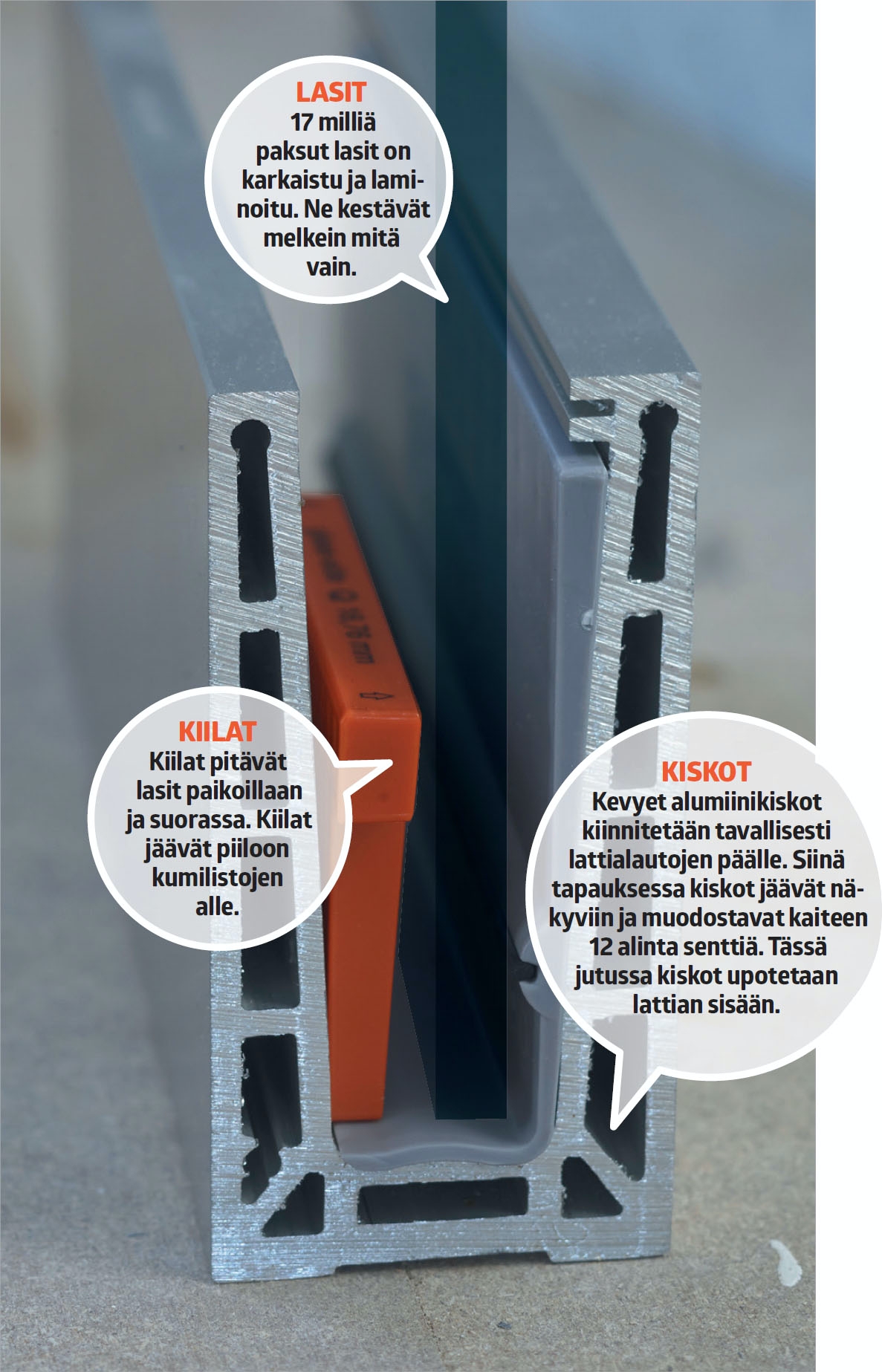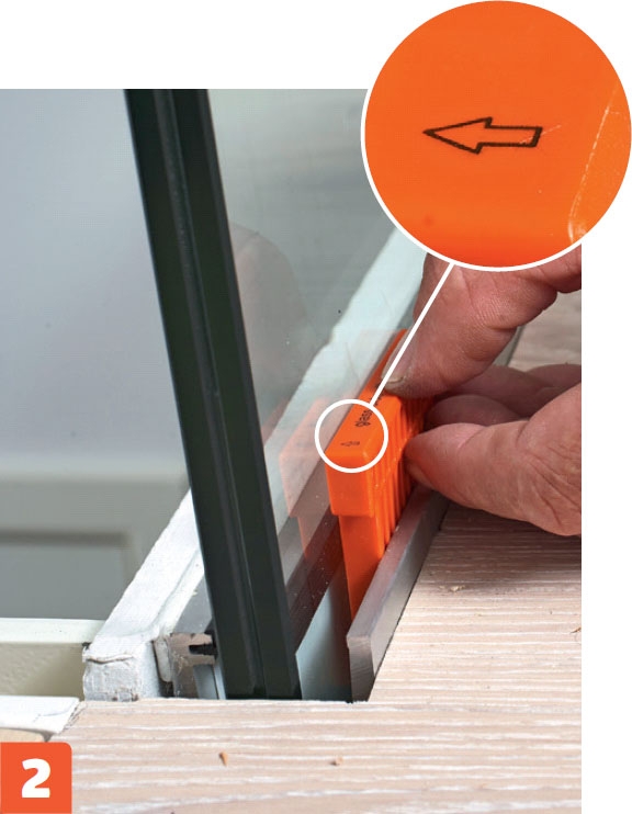 Kun lasi asennetaan paikalleen, se on kiilojen päällä ja painuu kumilistaa vasten. Asenna seuraavaksi oranssit kiilat, jotka lukitsevat lasit paikoilleen.