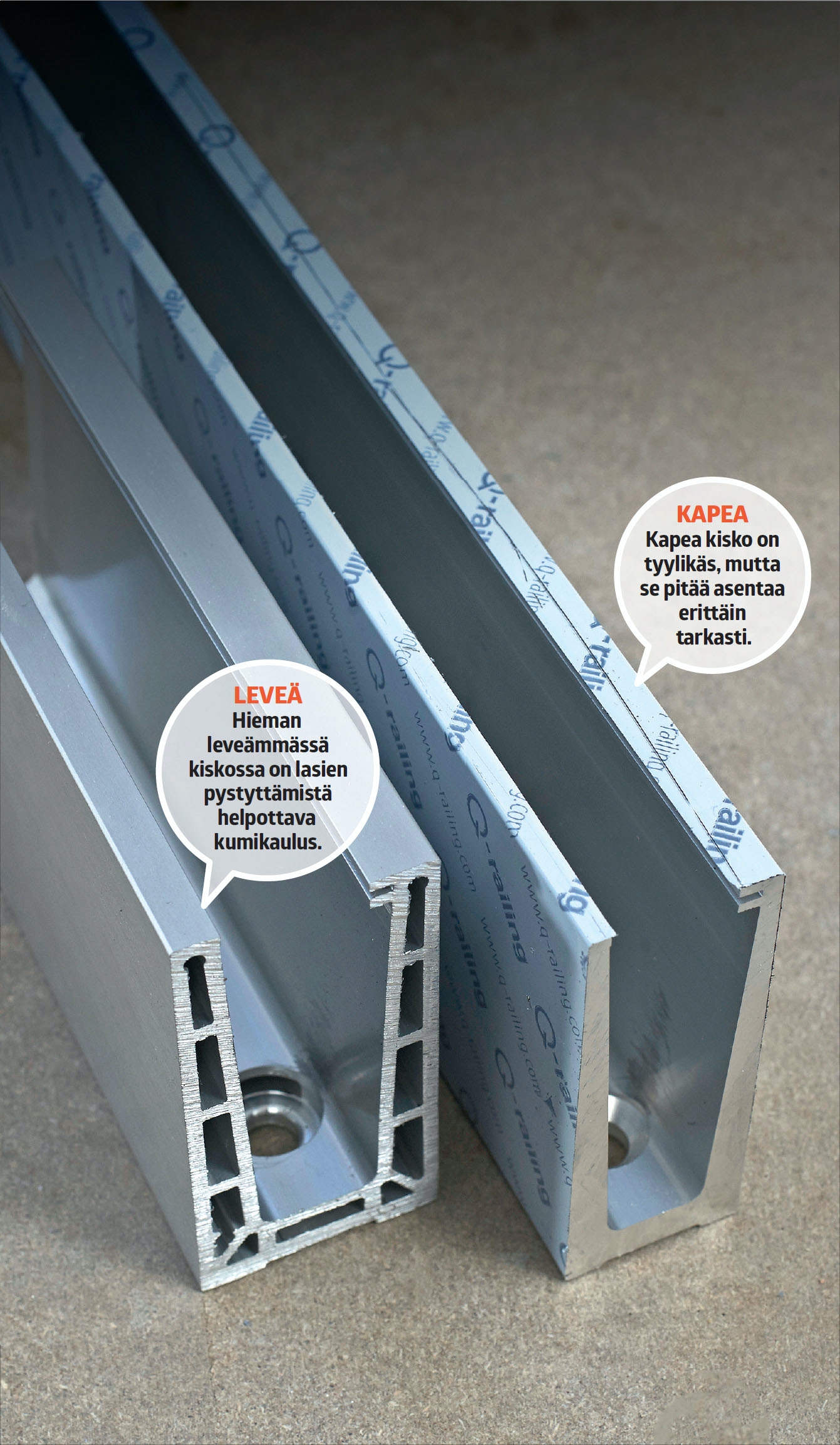 Näiden kaiteiden rakentamiseen käytetään Q-railing Easy Glass Slim -kiskoja, sillä ne sopivat päätypalkin leveyteen. Toinen vaihtoehto on hieman leveämpi Easy Glass Pro -kisko, jonka avulla laseja voi säätää hieman enemmän. Sen kumikaulus (ei kuvassa) pitää lasit pystyssä.