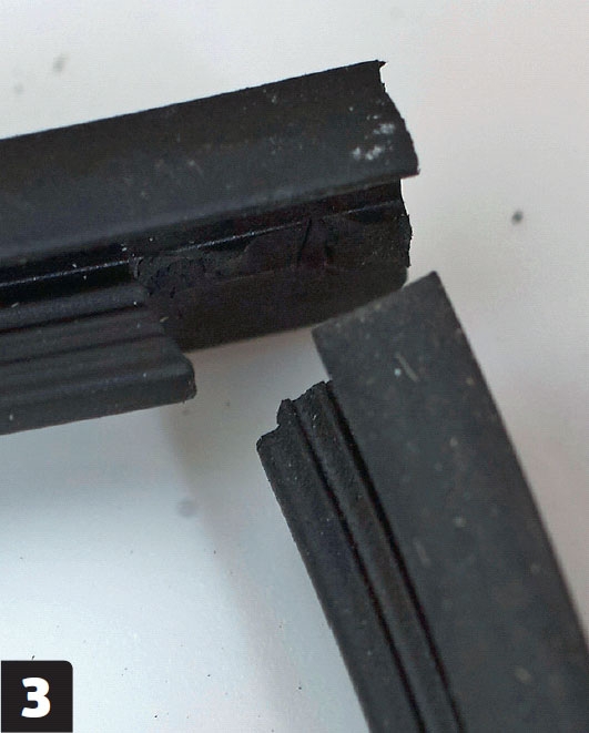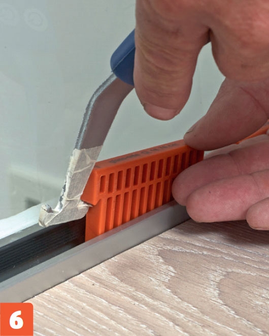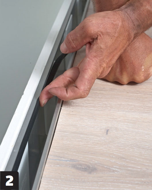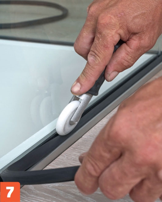 Kun valkoiset kiilat ovat paikoillaan, asenna kiskoihin kumilistat. Ne peittävät kiilat ja tiivistävät lasin ja kiskon välin, jotta kiskoon ei pääse roskia.