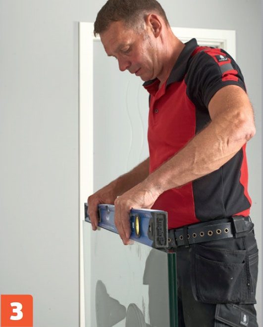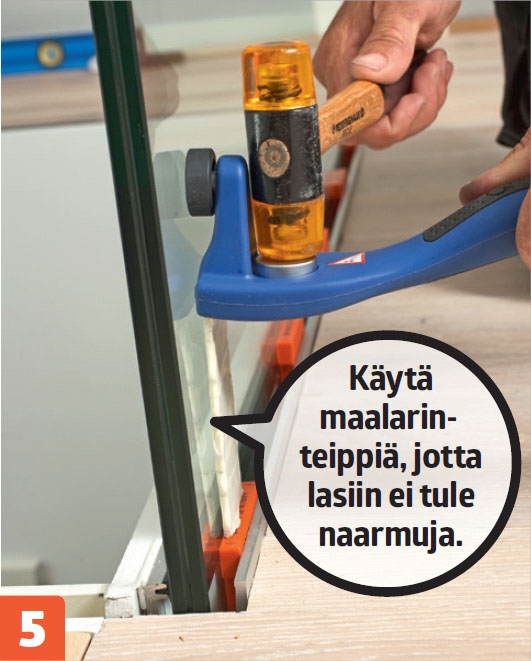 Tarkista, että lasi on vaakasuorassa. Jos lasi ei ole aivan suorassa, voit nostaa sitä toisesta päästä muovikiilalla.