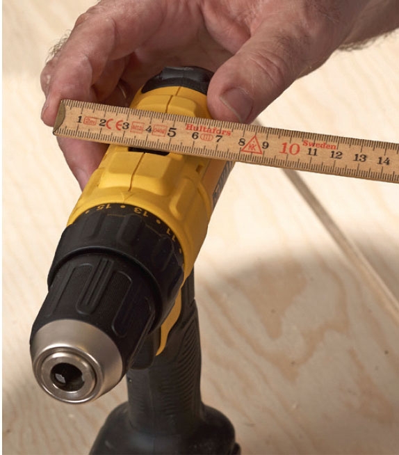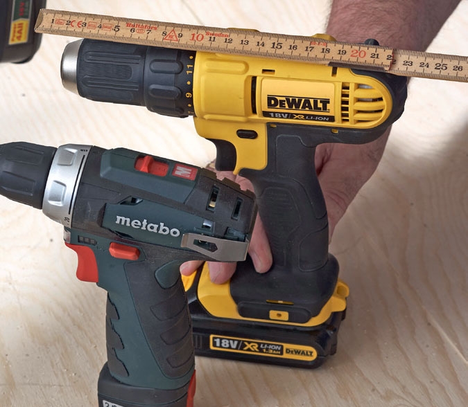 Porakoneen pituutta ei tule yleensä ajateltua. Hyllyn rakentaminen vaatii kuitenkin, että jokaisen koneen, akun ja laturin mitat tiedetään tarkasti.