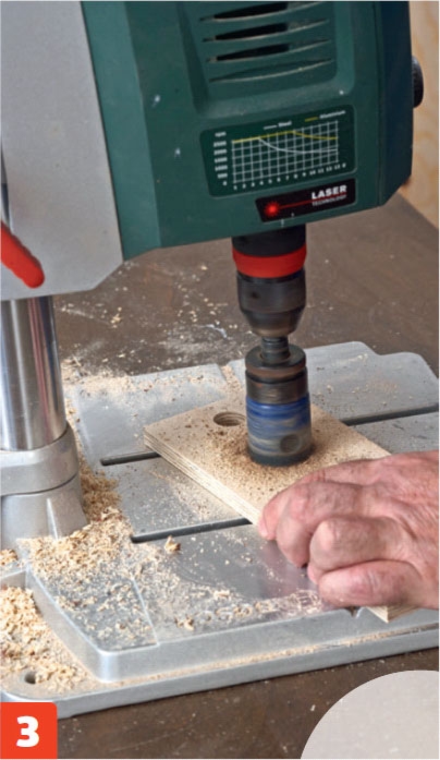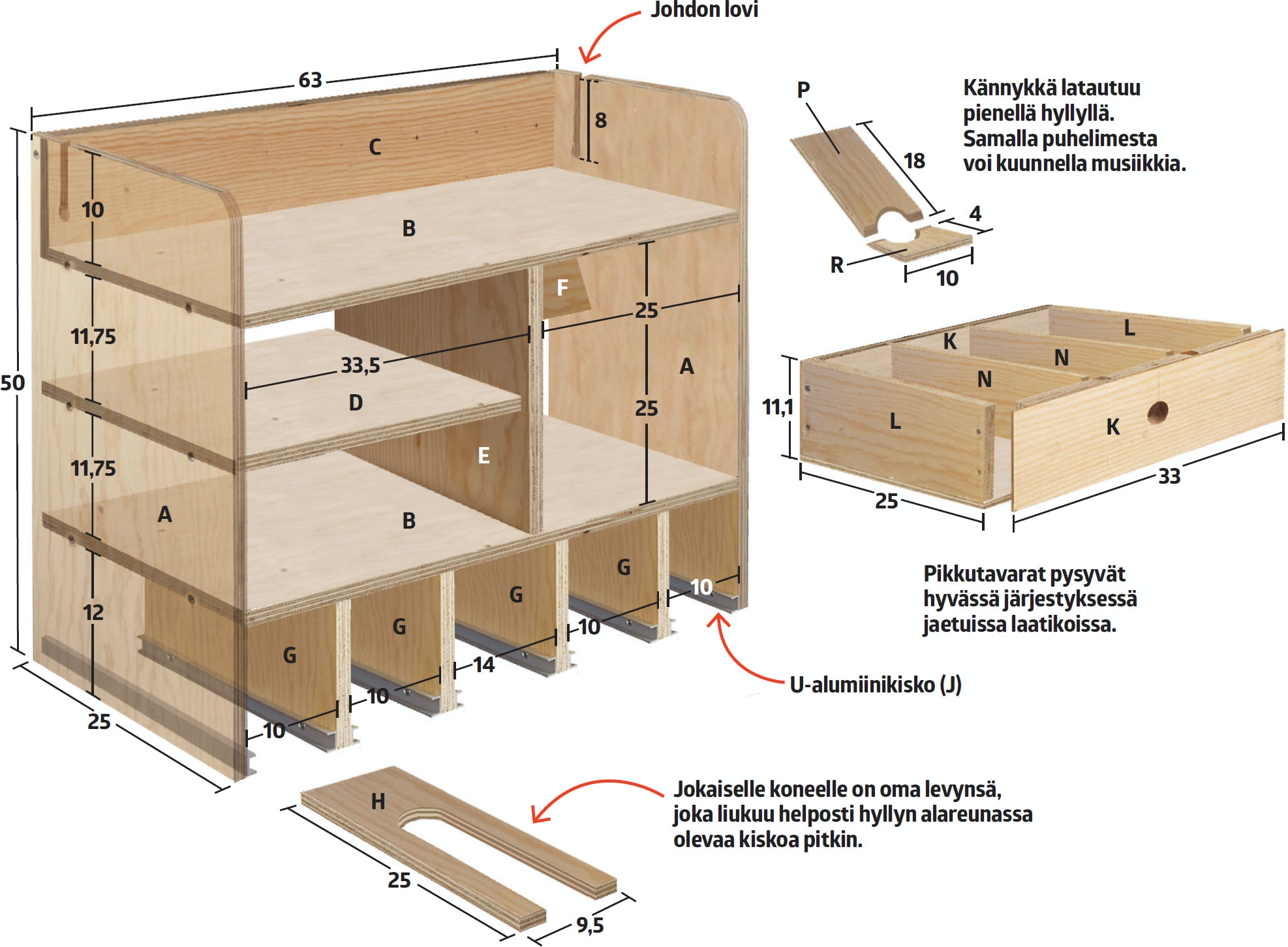 Tee joka koneelle sopiva hylly, jotta koneet on helppo ottaa käteen ja työntää takaisin. Mittaa koneet ja tee lovet niiden mukaan. Poraa loven taakse reikä, jonka halkaisija vastaa loven leveyttä. Sahaa lovi pistosahalla.
