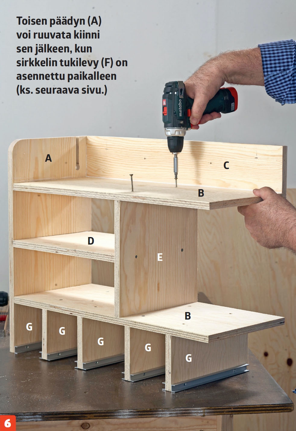 Kiinnitä alahylly (B) ja siihen liimatut väliseinät (G) kalusteen vasempaan päätyyn (A) liimalla ja 3,5x40 millin ruuveilla. Tarkista hyllyn suoruus suorakulmalla. Tarkista myös, että väliseinien ja päädyn (A) alareunat ovat samassa tasossa.