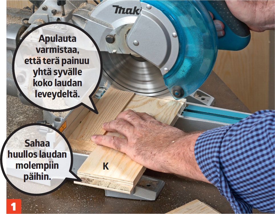 Säädä katkaisu- ja jiirisirkkelin syvyys-rajoitin 10 milliin. Tee merkit etu- ja taka-levyjen (K) molempiin päihin 15 milliä levyn reunoista. Poista puu sahaamalla monta vierekkäistä uraa. Siten levyjen päihin on helppo tehdä tyylikkäät liitokset.