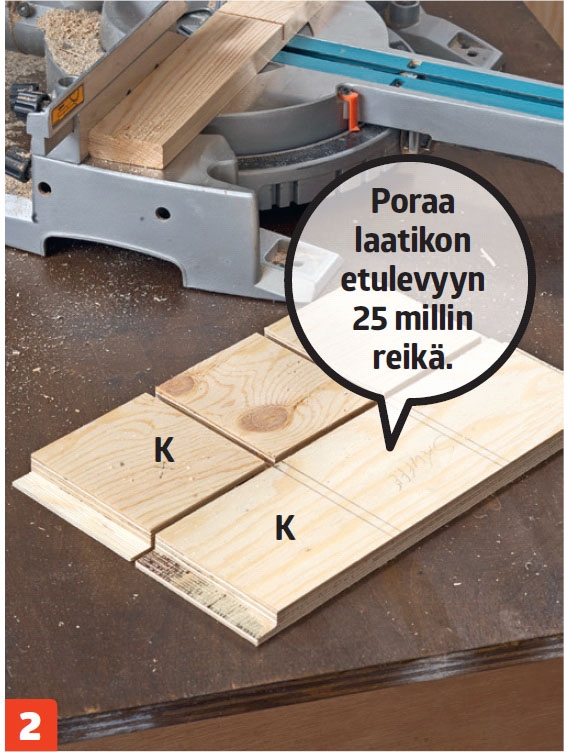 Tee laatikkoon lokerot. Sahaa laatikon etu- ja takalevyihin 7 milliä leveät ja 10 milliä syvät huullokset.