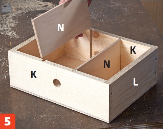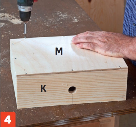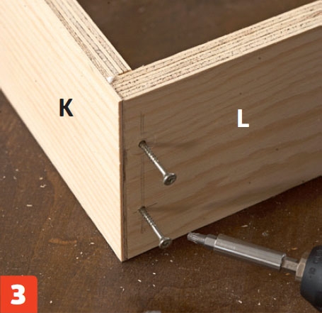 Paina laatikon sivut (L) huulloksiin. Kokoa laatikko liimalla ja kahdella 3,5x40 millin ruuvilla joka liitoksesta.
