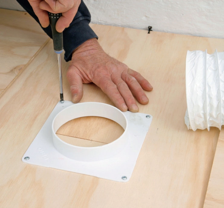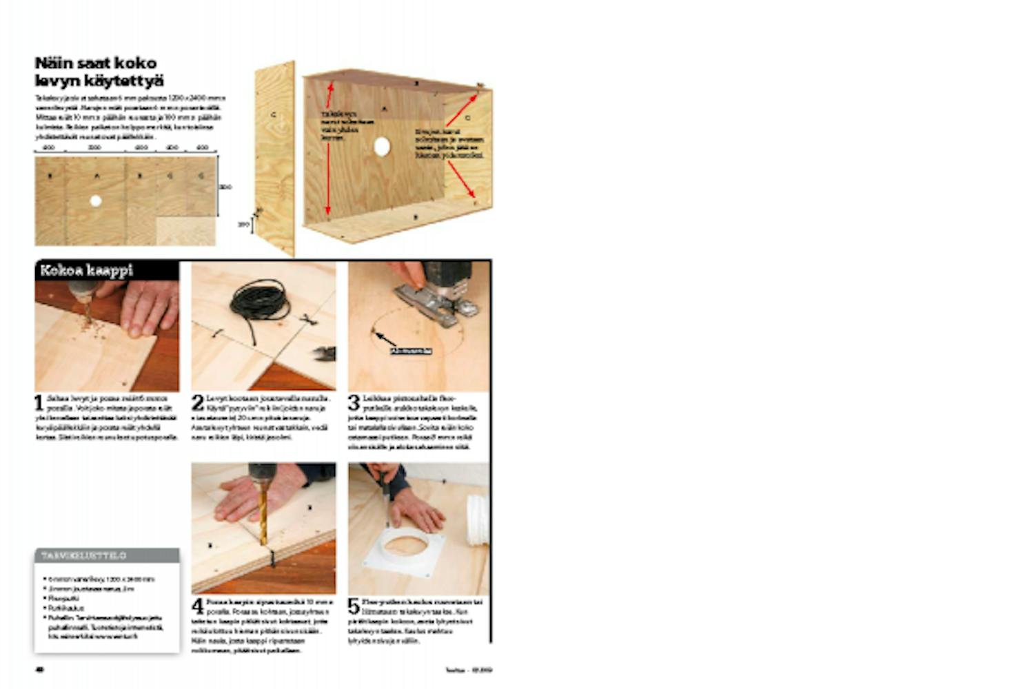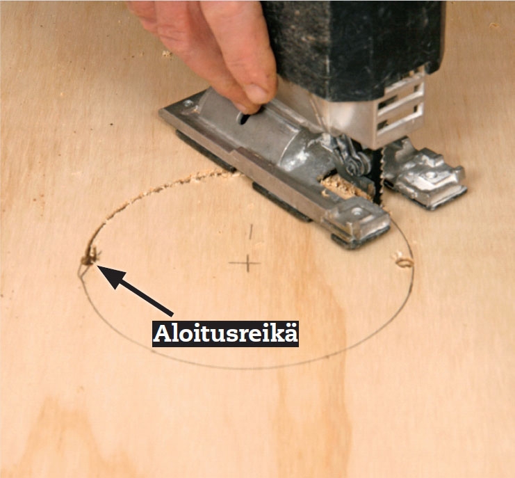 Leikkaa pistosahalla flex-putkelle aukko takalevyn keskelle, jotta kaappi voi seisoa vapaasti korkealla tai matalalla sivullaan. Sovita reiän koko ostamaasi putkeen. Poraa 8 mm:n reikä viivan sisälle ja aloita sahaaminen siitä.