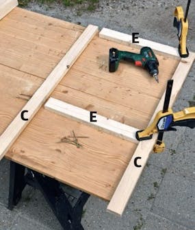 Kokoa päädyt (C ja E) suora kulmaisen levyn päällä. Kohdista osat samaan linjaan levyn reuno jen kanssa. Purista osat kiinni pöy tään puristimilla ja ruuvaa rimat yhteen 5x80 millin ruuveilla.