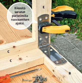 Runko on nyt valmis levyn kiinnittämistä varten. Nosta levy paikalleen ja ruuvaa se kiinni kahdella saranalla ja 3,5x20 millin ruuveilla uloimpiin poikkipuihin (D).