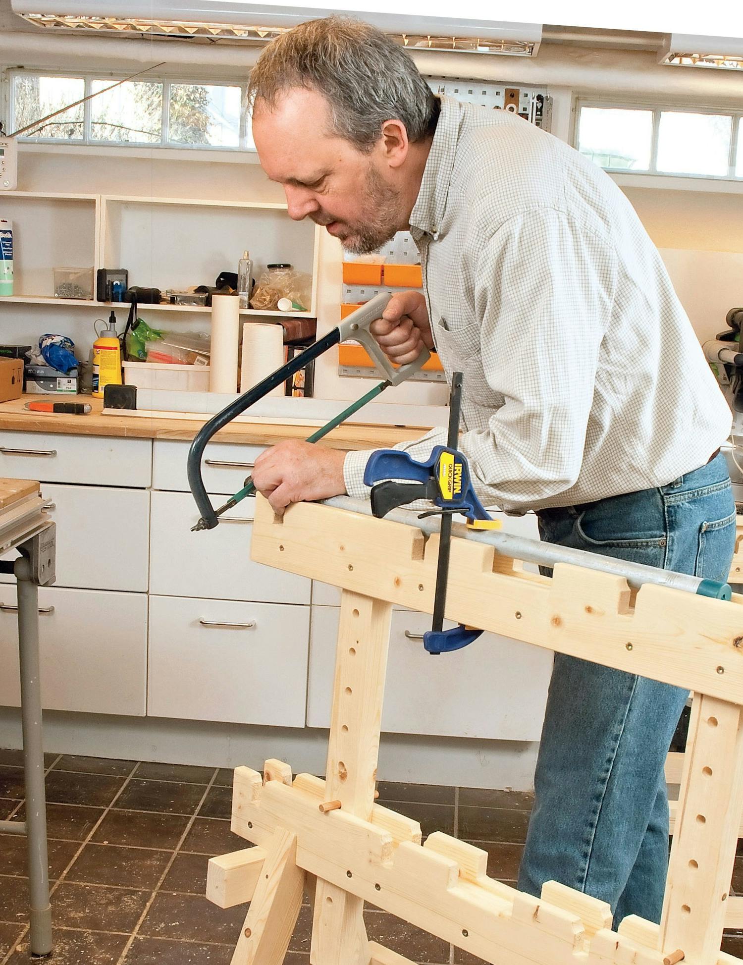 Ylin palkki liimataan sää-dettäviin pystyjalkoihin. Alimpaan palkkiin, siihen, joka kiinnitetään pukkiin kiinteästi, tehdään vastaavat reiät, joita pitkin kahta sää-dettävää jalkaa pystytään liikuttamaan ylös ja alas.