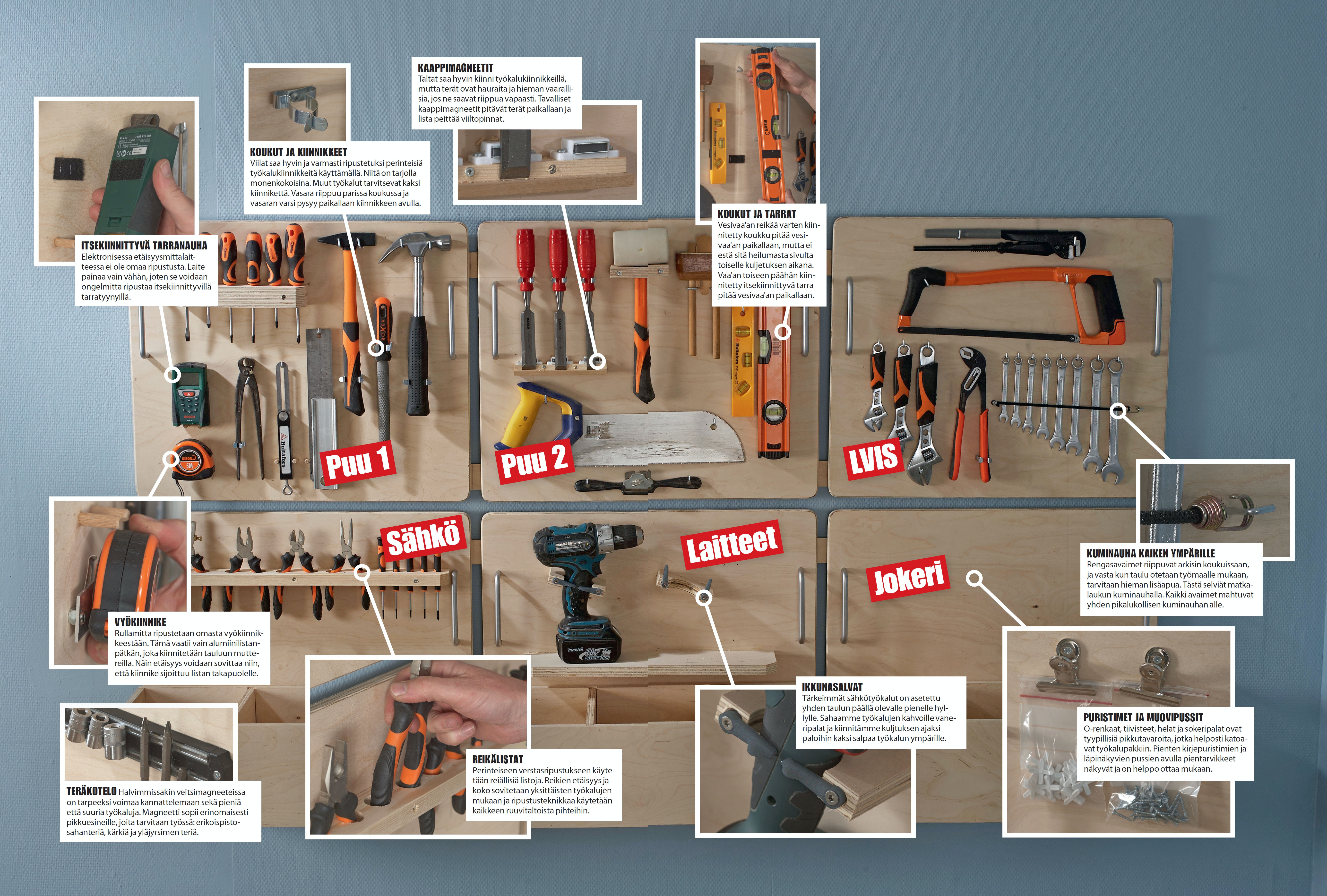 Työkalutauluun mahtuu 6 osiota, joiden luku-määrää ja muotoa voit vapaasti muuttaa niin, että ne sopivat omaan seinääsi ja työkaluil-lesi. Taulu rakennetaan 15 mm:n koivu- ja kuusiviilua sisältävästä sekavanerista, joka on noin puolet halvempaa kuin koivuvaneri ja lähes yhtä hyvänäköistä. Osioissa on kahvat, joten ne on helppo nostaa ripustuksestaan. Ripustukseen riittävät viistot listat. Jos et ra-kenna vaunua, voit asentaa alareunaan listan, joka pitää taulun pystysuorassa. Kiinnitä taulu kulje tus ta varten ylä- ja alareunasta.