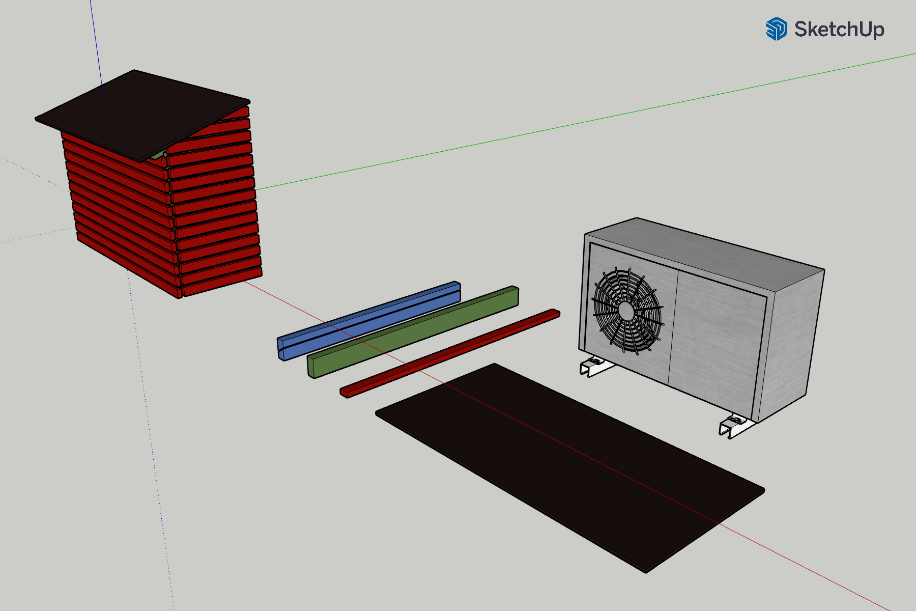 Tällä videolla näytetään aluksi, miten haet 3D-Warehousesta lämpöpumpun, jota voit käyttää mallina. Sen jälkeen näet, miten piirrät rungon, teet sille laudoituksen ja teet lopuksi katon.