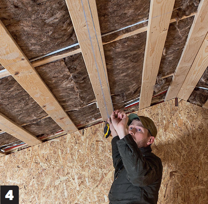 Merkitse katon keskikohta ylös ja alas ja räpsäytä värilangalla merkkiviiva kaikkiin harvalautoihin.