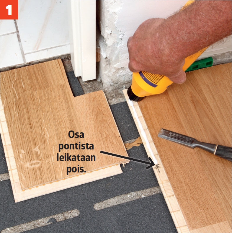 Poista pontin etuosa taltalla, jos viimeistä lautaa ei voi vääntää paikalleen. Levitä saumaan liimaa.