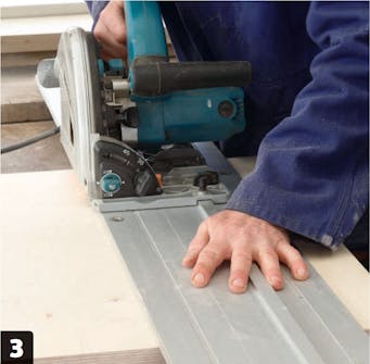 Ohjainkiskosta on paljon apua. Tässä käytetään pistosahaa, mutta monissa pyörösahoissa voi myös käyttää kiskoa, mikä parantaa tarkkuutta huomattavasti. Suuri pöytäsirkkeli on sekin kätevä työkalu, jos käytössä on sellainen.