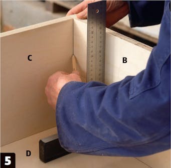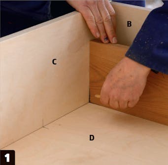 Jyrsi takalevyn kohtaa, jossa hyllyosan pystysuora välilevy (F) on takalevyä (D) vasten. Hyllyjen välilevyn takana olevat apulevyt varmistavat, että levy pysyy pystysuorassa ja vakaassa asennossa, jotta kone saa tukea jyrsinnän aikana.
