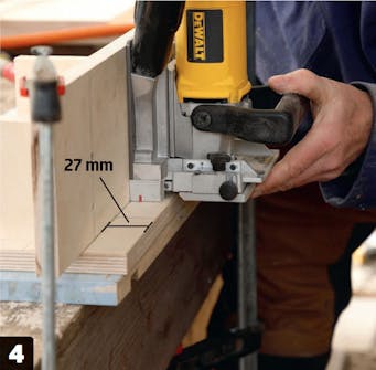 Nyt voimme vihdoin koota etätyötason. Teemme sen lamellikekseillä, joille jyrsittiin urat.