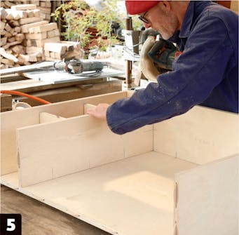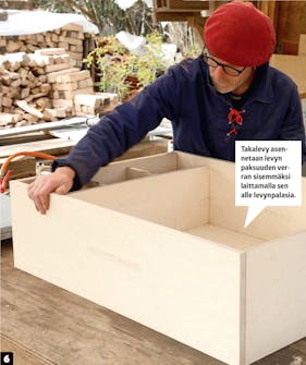 Kokoa levyt kynän merkintöjen mukaan. Kun viivat kohtaavat, myös lamelleille jyrsityt urat osuvat kohdalleen. Voit myös pitää kulmat yhdessä teipillä, jos kaikkia levyjä on vaikea pitää paikallaan.