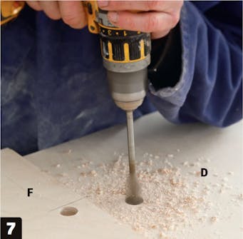 Poraa reiät pystysuuntaiseen hyllyjen välilevyyn ja takalevyyn johtojen vetämistä varten. Reikä porataan molemmilta puolilta siten, että poranterä tunkeutuu juuri ja juuri esiin. Sitten levy käännetään ja reikä porataan valmiiksi.