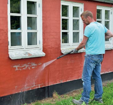 Huuhtele julkisivupuhdiste pois. Tässä käytämme painepesuria, jolla saa myös lohkeilleen maalin irti. Voit myös harjata seinän jäykällä harjalla ja vedellä.