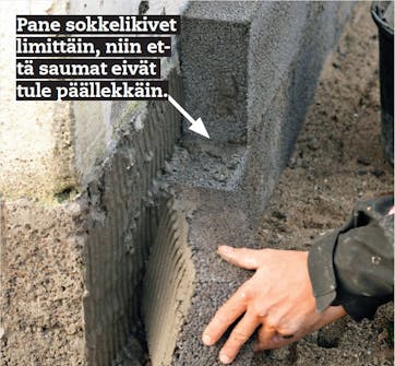 Liu'uta sokkelikivet paikoilleen, kun olet levittänyt ohuen kerroksen laastia. Tarkista vesivaa'alla, että kivet ovat suorassa. Seuraava kerros on silloin hel-pompi panna paikoilleen. Toinen kerros muurataan limittäin ensimmäisen päälle.